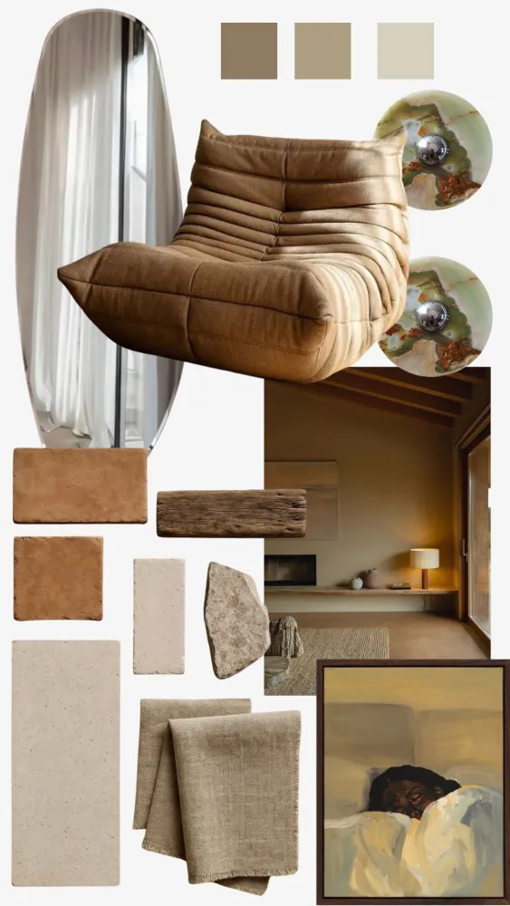 Le moodboard MNG Studio célèbre la douceur des tons terreux, les beiges enveloppants et les nuances minérales subtilement contrastées.