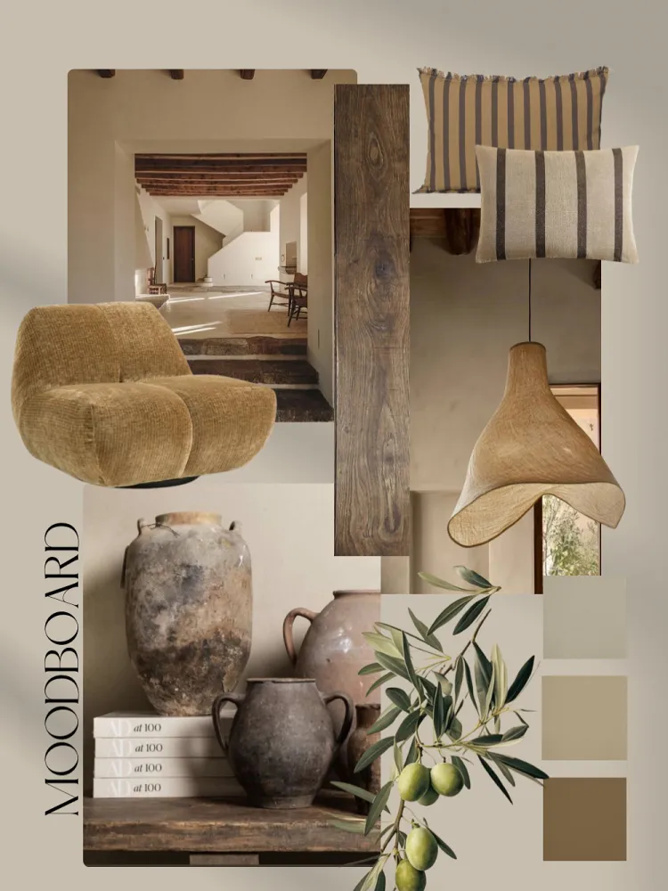 Ce moodboard raconte une histoire de matières brutes, de lumière naturelle et d'authenticité. L'esprit qui s'en dégage est celui d'une maison vivante, ancrée dans la terre et ouverte sur la douceur du sud.